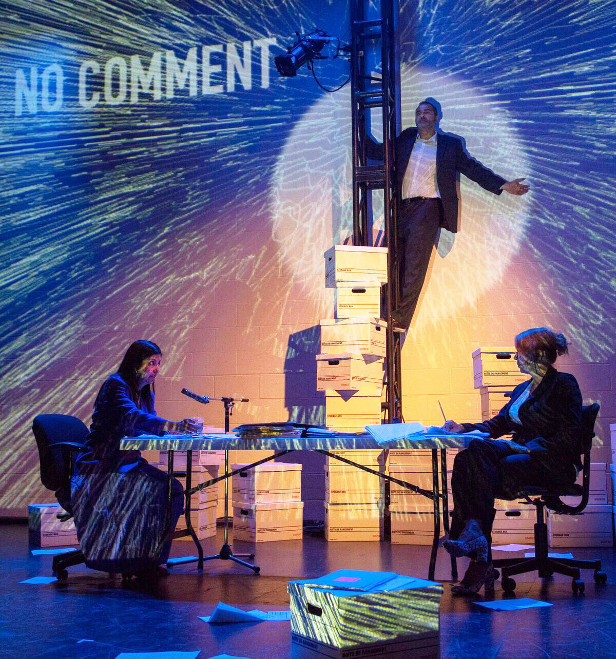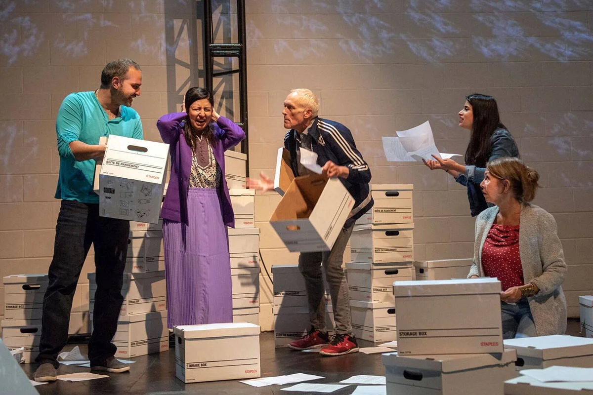 “The visuals play a huge role in Victim Impact, with projections by Milton Lim used throughout the performance. Joel Grinke’s set shifts with movable screens and bankers boxes lining the back, transforming the stage into a court room.” - Katie Gartlan-Close, vancouverpresents.com, June 2018